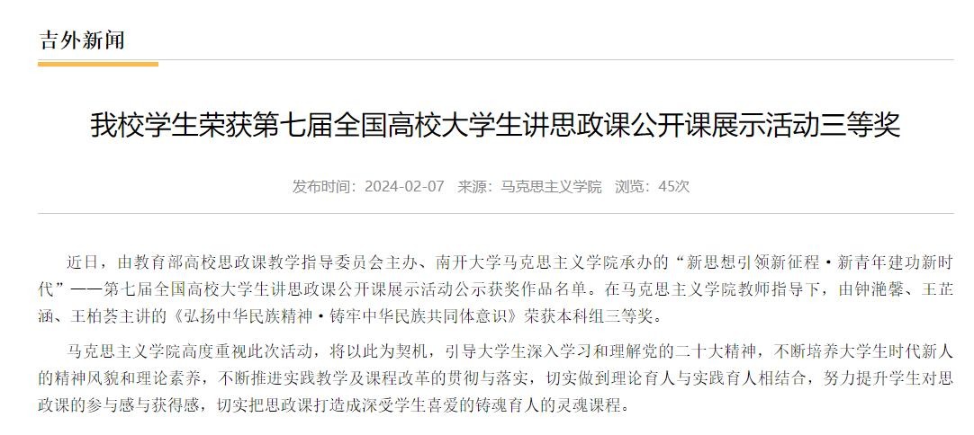 我校学生荣获第七届全国高校大学生讲思政课公开课展示活动三等奖