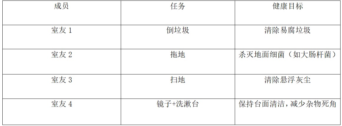 科学分工表(以 4 人寝室为例)科学分工表(以 4 人寝室为例)科普解读:不同清洁任务对应不同 “污染物”—— 扫地清除灰尘、毛发(减少呼吸道刺激),拖地去除地面细菌(如鞋底带入的室外病菌),擦窗户增加通风(新鲜空气能降低室内细菌浓度,通风好的寝室,细菌数量比密闭寝室少 40%)。