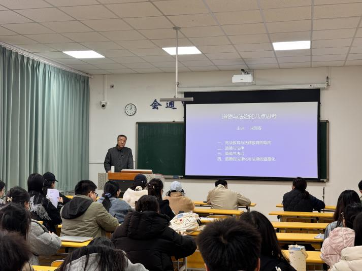 讲座围绕宪法教育与法律教育的取向、道德与法律、道德与法治、道德的法律化与法律的道德化四个核心内容展开。宋海春教授深入解读习近平法治思想核心要义,并结合国家安全法、爱国主义教育法、典型司法案例,生动阐释德法共治的实践要求。讲座中,宋海春教授结合现实案例剖析执法司法中的道德尺度与价值导向,引导师生正确认识道德与法律的辩证关系,现场互动积极、研讨深入,有效强化了理论认知与实践理解。