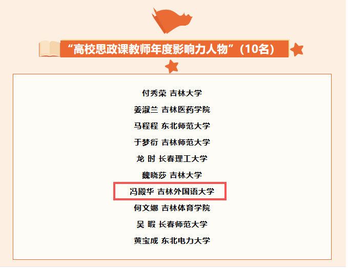 经学校党委推荐、省教育厅专家评审和公示等环节,我校马克思主义学院副院长冯殿华获评2025年吉林省“高校思政课教师年度影响力人物”。