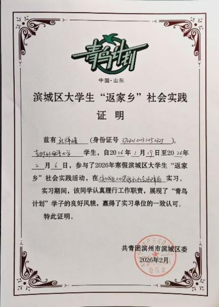 在2026年寒假“返家乡”社会实践活动中,2025级马克思主义基本原理专业研究生孔祥媛同学积极响应号召,主动对接家乡基层岗位,参与了2026年寒假山东省滨城区大学生“返家乡”社会实践活动,奔赴山东省滨城区人力资源和和社会保障局,开展了为期三周的实践服务活动,用青春力量为家乡民生事业发展添砖加瓦。孔祥媛同学秉持着“会通中外、砺志敦材”的校训,以认真负责的工作态度、扎实肯干的工作作风,圆满完成了各项实习任务,赢得了实习单位的高度认可。
